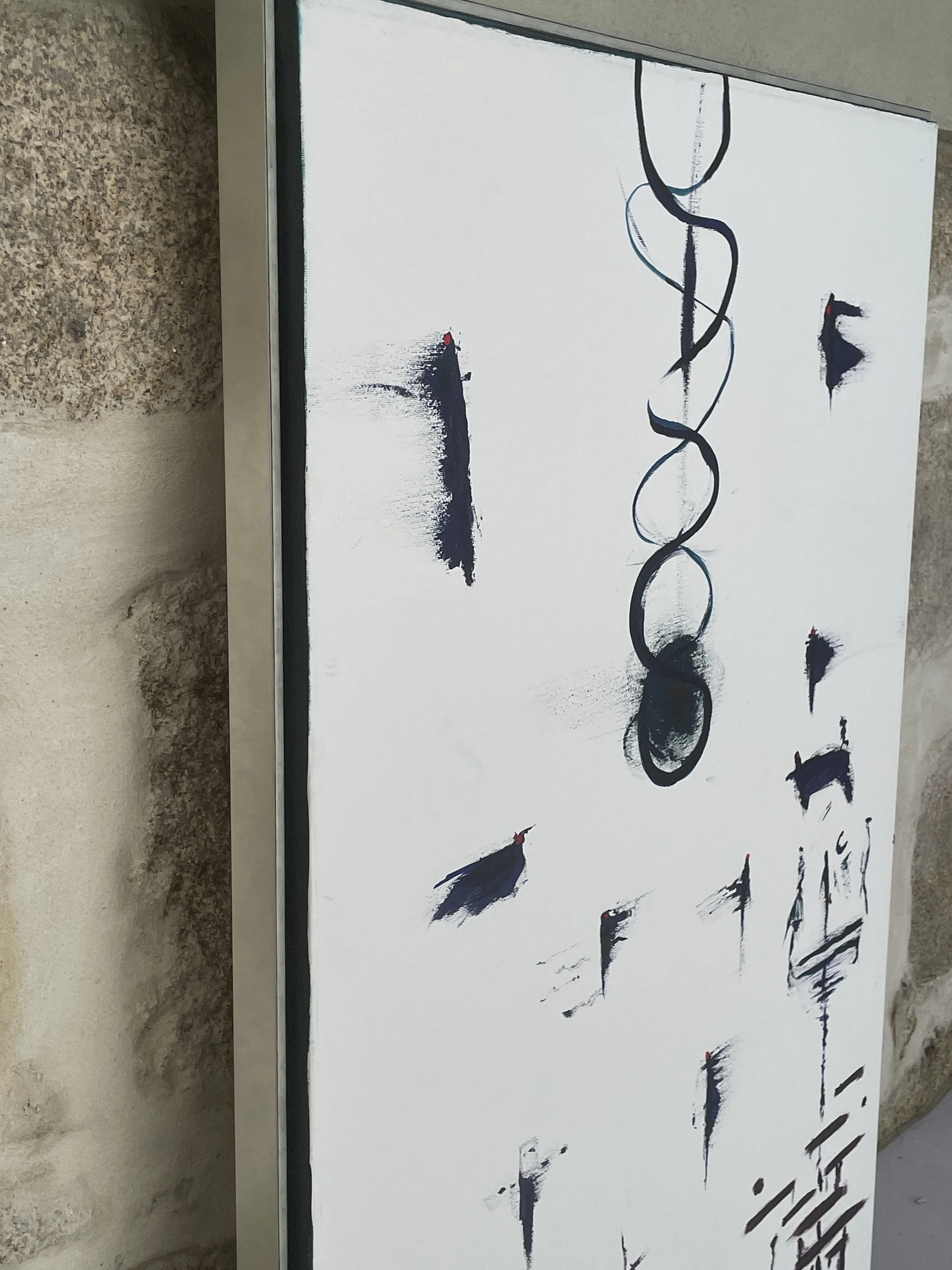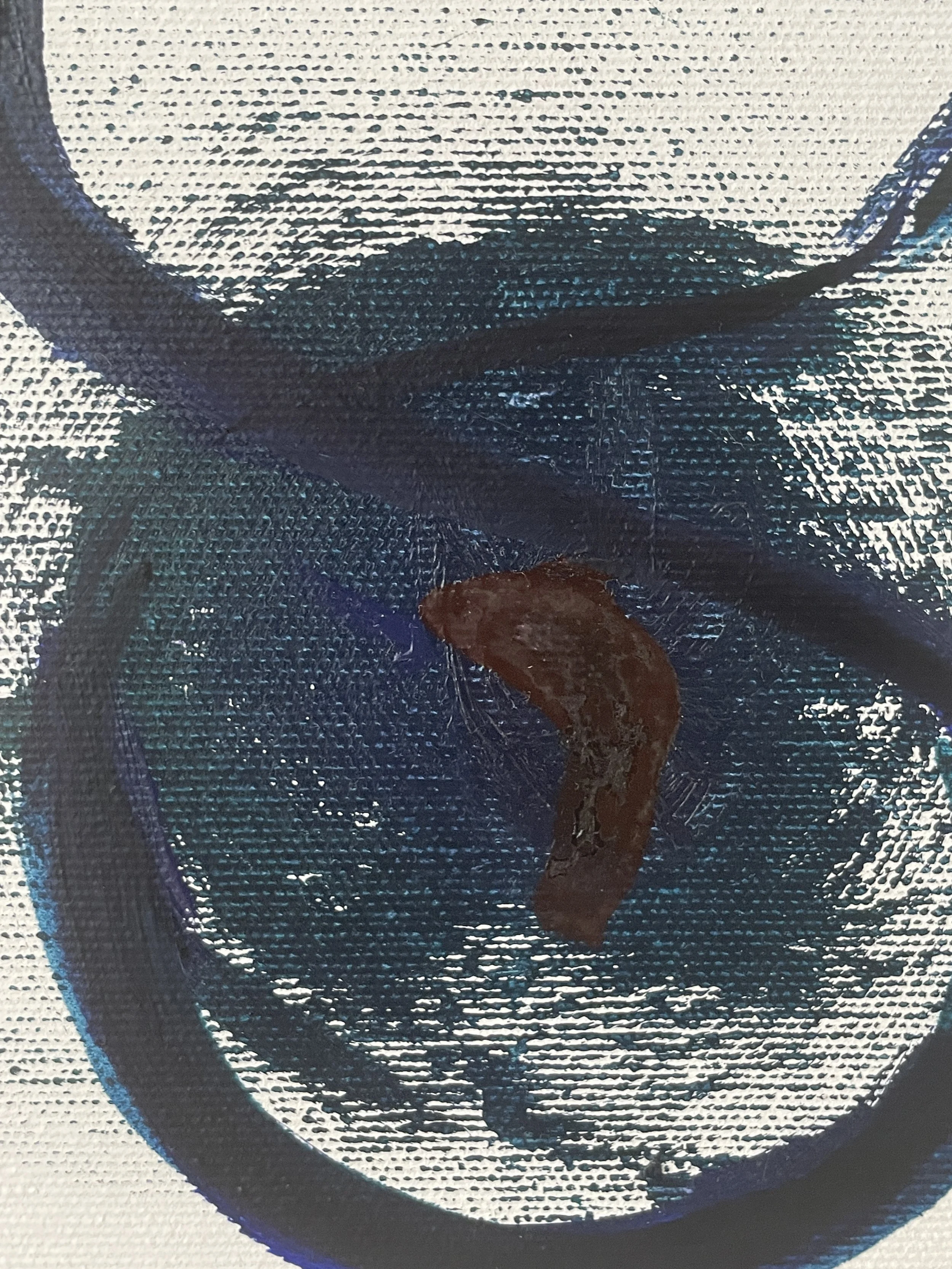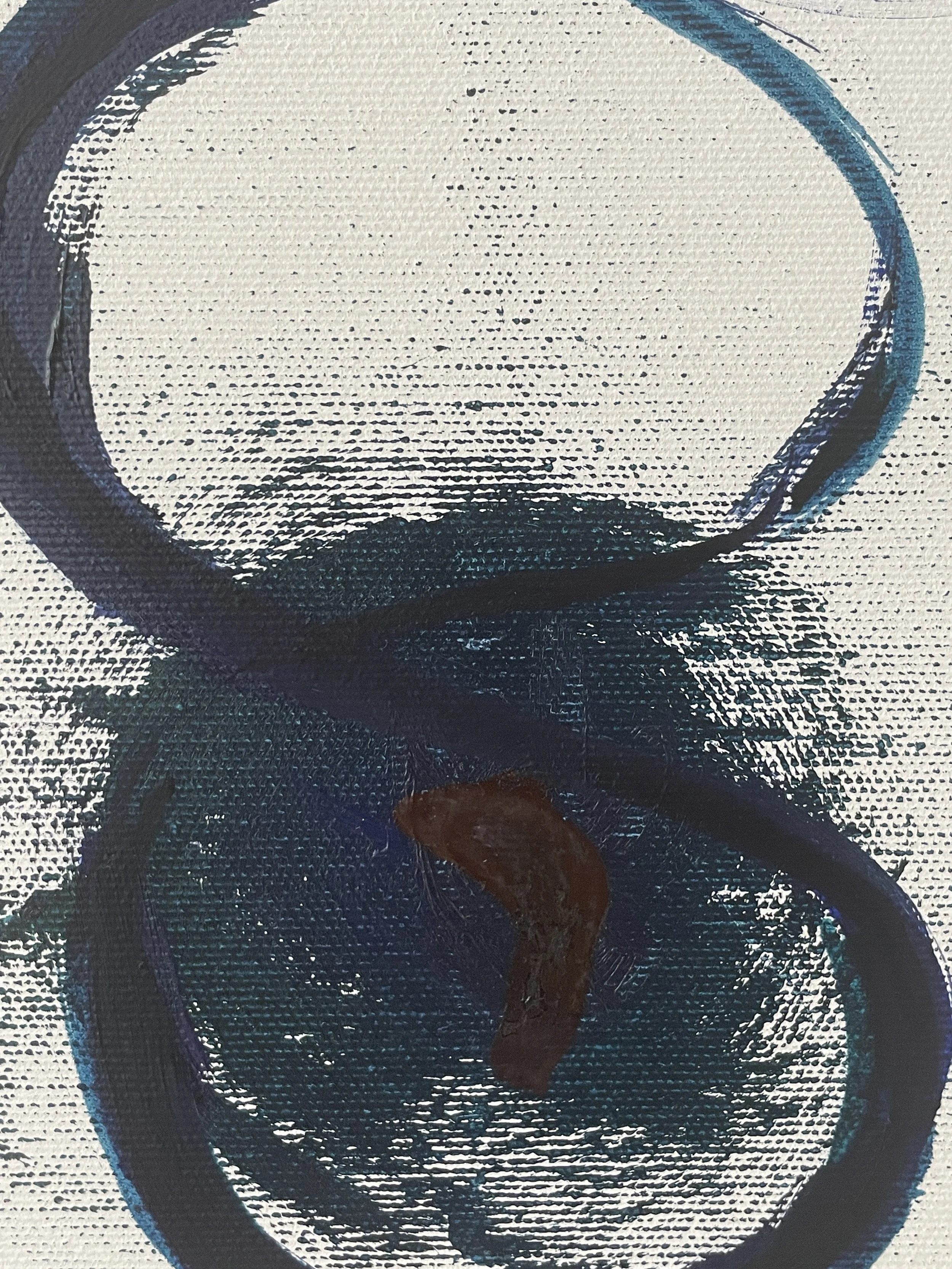 In gnostic traditions, Sophia, driven by an independent desire to know the unknowable, acted outside of the current causing a rupture in the divine order, leading her to a fall into the lower realms. Sophia merges masculine and feminine qualities and represents the integration of polarities through transmutation of feminine darkness. In the painting the shadow entities represent lost and suppressed aspects of femininity due to abuse and persecution, together with Seraphim angels; there is also a a representation of the The Maiden, The Mother and The Crown, a triad that represents the cyclical nature of life: The Maiden walks towards the deep sea (the subconscious) under a Balsamic Moon while The Mother and The Crown watch and protect her initiation and descent into the underworld. She enters the underworld not to be lost but to pick herself back — returning whole and anew.